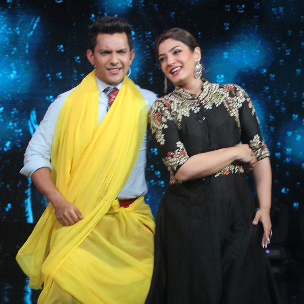 It so happened that the ladies’ man on the sets, host Aditya Narayan, in his quest to woo Raveena, requested her to share a quick tip with everyone on how to nail performing her hit song‘tip tip barsa paani’. To this, Dadi (Dipali Borkar, his co-host) interrupted Aditya by putting in a fun condition. She insisted that Aditya along with three other male contestants- Sahil Solanki, Tanmay Chaturvedia and Sonu Gill drape yellow chiffon sarees and only then can they take lessons from Raveena. Seeing the boys sporting beautiful yellow sarees, Raveena graciously accepted Aditya’s proposal and joined them on the stage to perform the famous song much to everyone’s delight!